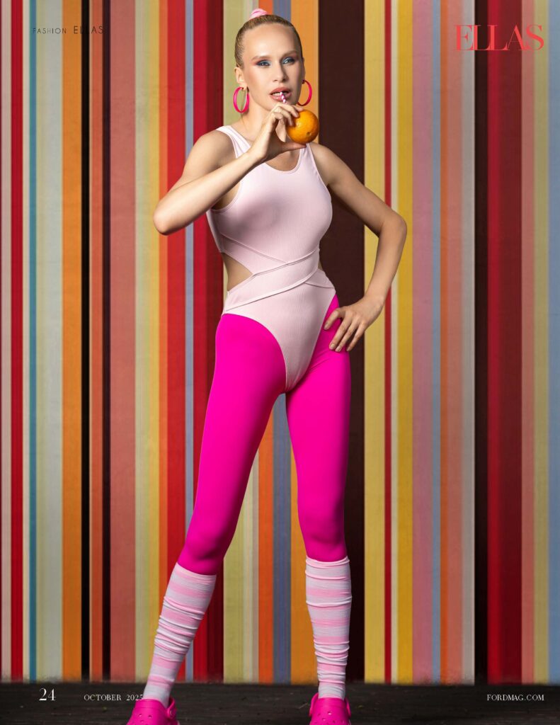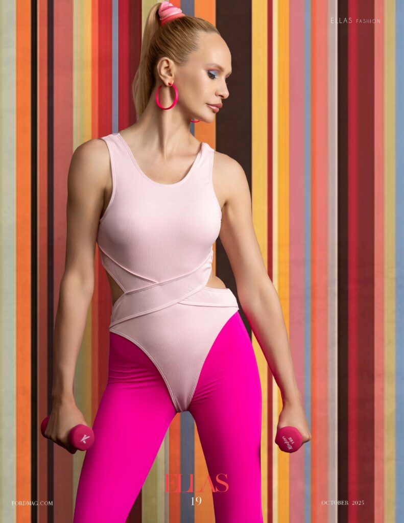 and aerobics with high-fashion flair. From hot-pink leggings to lime-green details, every look screams motion, color,